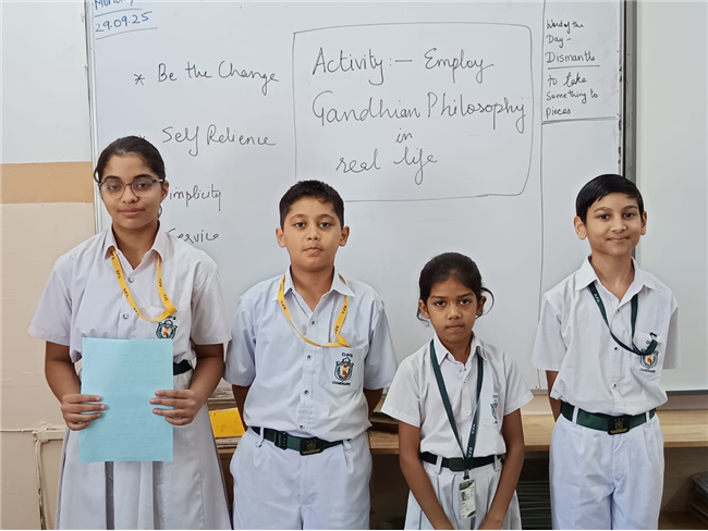 Students of Class VI of Delhi Public School participated in an engaging activity, "Gandhiji's Principles in Action," designed to teach the importance of Gandhian way of life on 29 September, 2025. Students were presented with real-life situations and case studies that demonstrated the application of Gandhiji's principles, such as honesty, nonviolence, and Swadeshi. Through group discussions and role-plays, students explored ways to apply these principles in their own lives and in their community. The activity aimed to inspire students to adopt Gandhiji's principles and values, empowering them to become responsible and compassionate individuals who contribute positively to society. In addition, the activity helped to nurture students' moral and ethical development, inspiring them to become active citizens who make a positive impact in their communities.